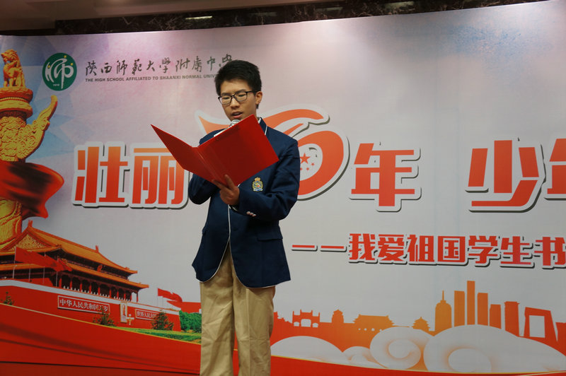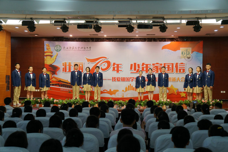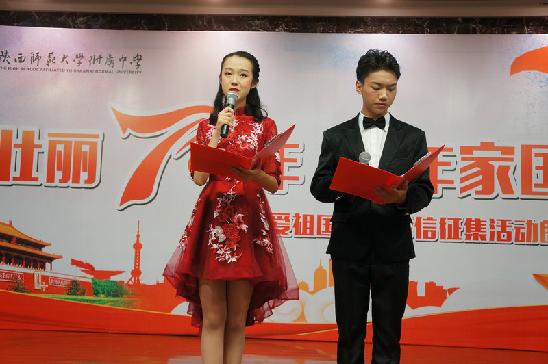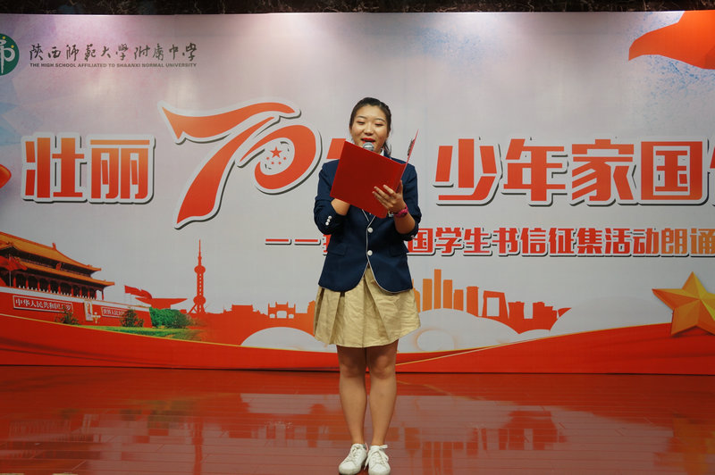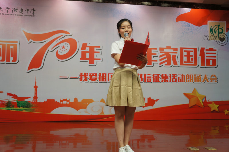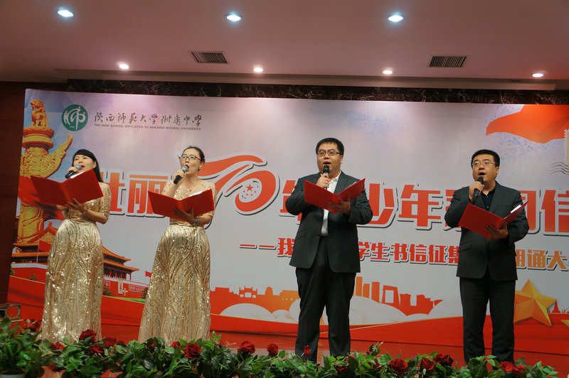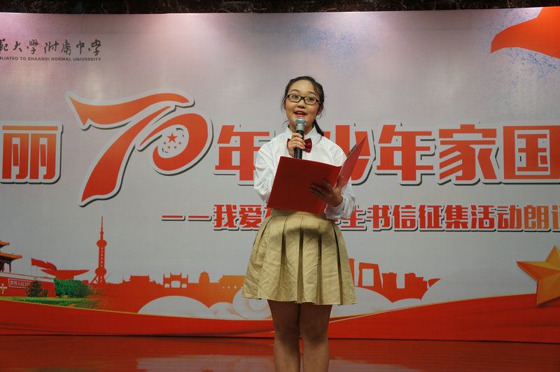 隨后,陜西省朗誦協會副會長曉河為大家誦讀了高二5班周佳奕的作品《我有幸》,曉河老師的誦讀飽含真情,現場掌聲此起彼伏,接著由我校11位廣播站成員和語文教研組長萬瓊老師分別為大家誦讀了參與此次書信征集活動的入圍作品,他們是:高二1班張可璇的作品《親愛的祖國》、高二7班李思哲的作品《我和我的祖國》、高二2班江碧薇的作品《祖國啊,我愿意做你的孩子和戰士》、高二3班戴鑫藝的作品《奶奶愛上了手機支付》、分校韓靜儀的作品《那時的奶奶是全西安最好飯堂的廚師》、高二3班徐伊諾的作品《與國漫共成長》、初二10班剡雪杭的作品《垃圾分類后再來看大美西安》、高二1班王子竹的作品《萬水千山,你是最深的牽掛》、高二2班郭婧語的作品《祖國,我這樣理解你》、高二5班向藝穎的作品《最美樂章》,各位誦讀者聲情并茂、鏗鏘有力、熱情激昂的表現力時而將現場觀眾帶去了祖國遼闊的田野、時而又讓大家目睹了祖國70年來日新月異的發展與變化,大家用語言的藝術向現場觀眾傳遞著書信的思想內容,傾訴和表達著對未來、對夢想、對親人的問候和祝福,對家鄉、對祖國的滿腔熱愛,引起現場觀眾的共鳴。其中,我校高一3班羅今一與問丁元老師帶來的一首《我愛你中國》掀起了此次活動的高潮,大家一起唱響紅歌,轟動全場!
