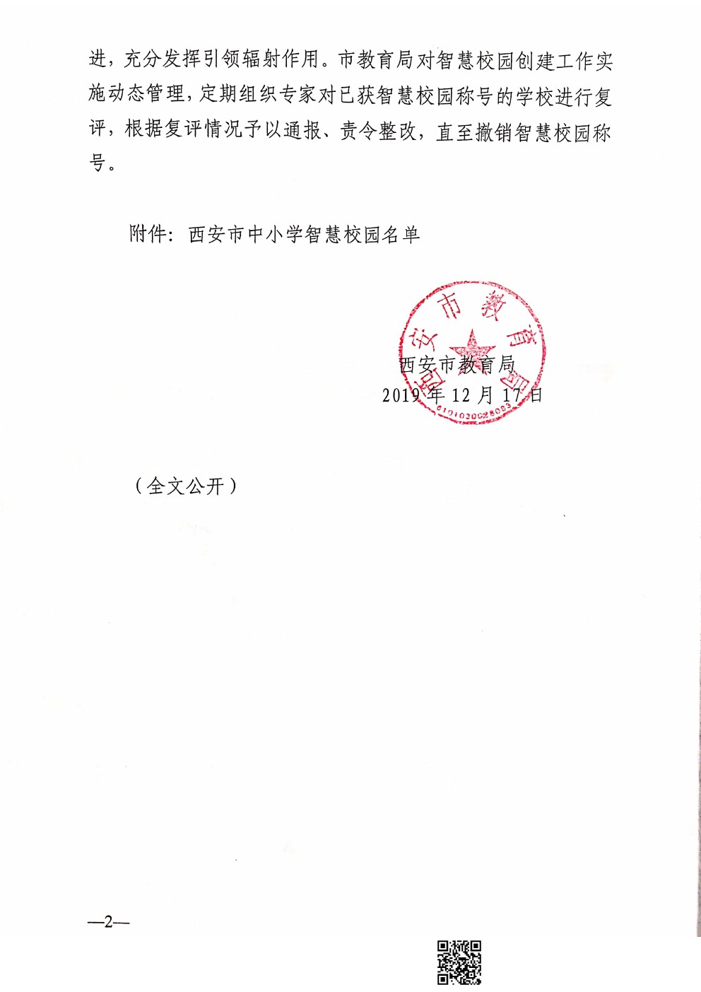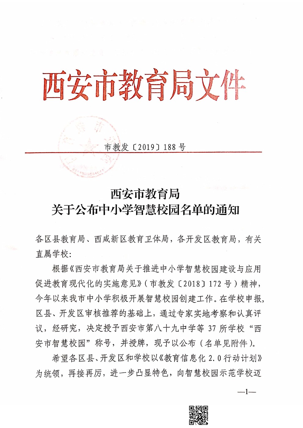 經過學校申報, 區縣、開發區審核推薦的基礎上,通過專家實地考察和認真評議,經研究,決定授予我校為首批“西安市智慧校園”稱號。相關文件如下: