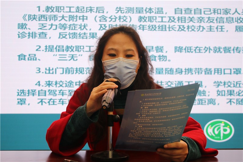 隨后,政教處副主任鮑青青、教務(wù)處主任張?jiān)肌⒖倓?wù)處主任陳宏社依次就教職工一日規(guī)范、學(xué)生一日規(guī)范、錯(cuò)峰上下學(xué)、復(fù)習(xí)備考、補(bǔ)償性教學(xué)、學(xué)生就餐、消毒等事項(xiàng)做了全面、詳細(xì)的培訓(xùn)和安排。