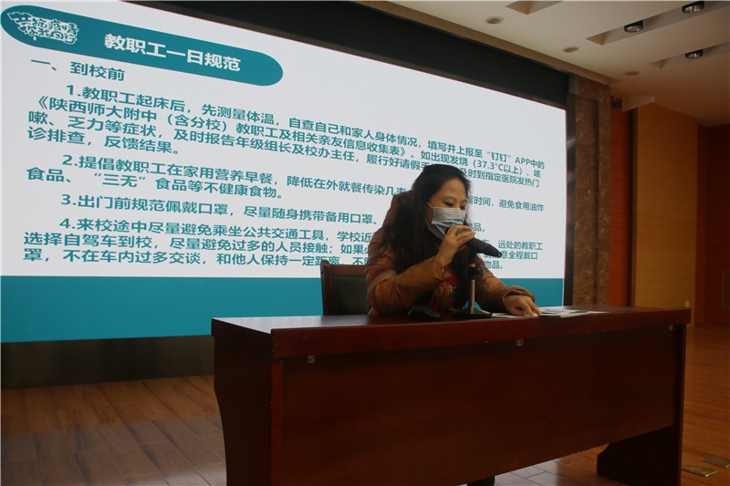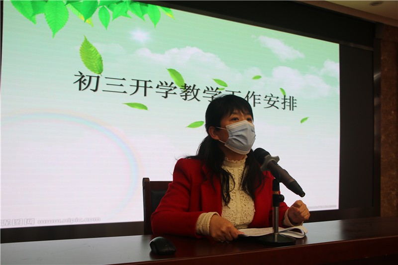 隨后,政教處副主任鮑青青、教務處主任張元芳、總務處主任陳宏社、校辦主任張輝依次就教職工一日規范、學生一日規范、錯峰上下學、復習備考、補償性教學、學生就餐、消毒、掃碼入校、每日一報、考勤等事項做了全面、詳細的培訓和安排。