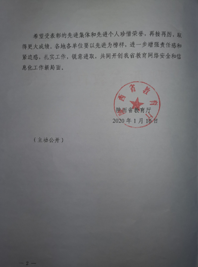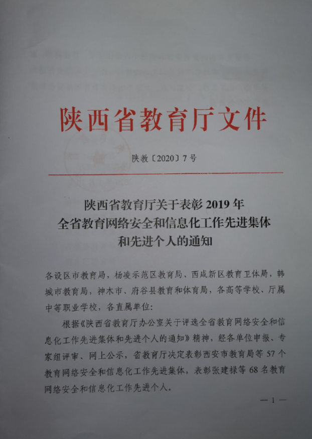 近日,陜西省教育廳印發《關于表彰2019年全省教育網絡安全和信息化工作先進集體和先進個人的通知》,我校榮獲“2019年全省教育網絡安全和信息化工作先進集體”稱號。馮軍同志被授予“2019年全省教育網絡安全和信息化工作先進個人”榮譽稱號。