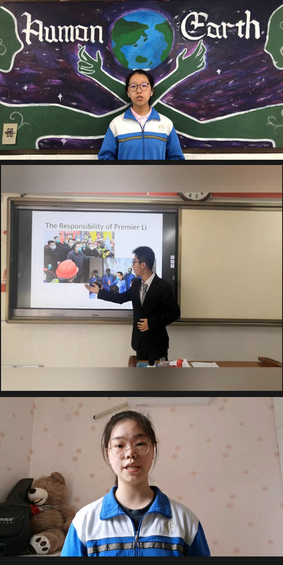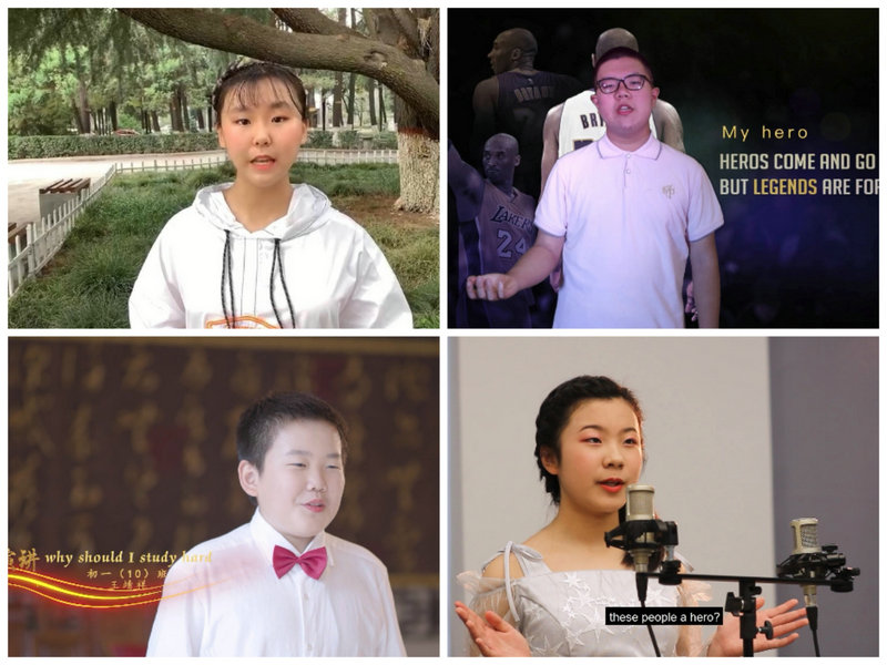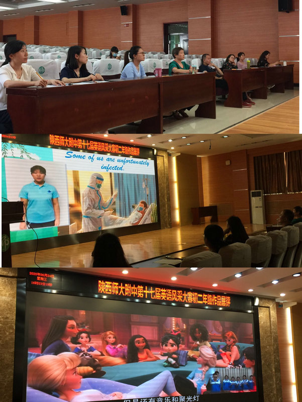經過激烈角逐,初一9班焦畹同的作品《My hero》、初二2班高王紫的作品《United, we stand; divided, we fall.》、高一5班王婧涵的作品《Attitude decides everything》、高二1班王嘉琪的作品《The Advantages and disadvantages of online courses》、6班梁藝萱、7班景朝陽的作品《What can we learn in harm's way during the COVID-19?》榮獲個人演講環節第一名;初一8班蕭麟懿、吳卓昕帶來的歌曲《Counting stars》、初二6班梁海超、劉高逸飛的作品《Irony》、高一1班田雯嘉、王云莉、羅今一的作品《Head Above Water》、高二8班蔡雨楠的作品《Me and the Sky》榮獲歌曲演唱第一名;初一7班李佳同等同學的作品《瘋狂動物城》、初二9班陳瑗舒等同學的作品《精靈旅社》、高一7班牛孫家燁等同學的作品《傲慢與偏見》、高二5班郝昱開等同學的作品《The Lion King》榮獲電影配音環節第一名。