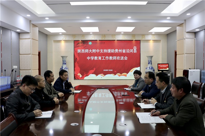 2020年11月3日下午5點40分,陜西師大附中支持援助貴州省沿河縣中學教育工作教師歡送會在崇是樓五層小會議室舉行。我校校長馮軍,黨委書記陳勇剛,副校長郭勝、高麗文,校辦主任張輝,總務處副主任李煒,以及參與支教的韓談判、居凱兩位老師參加會議。