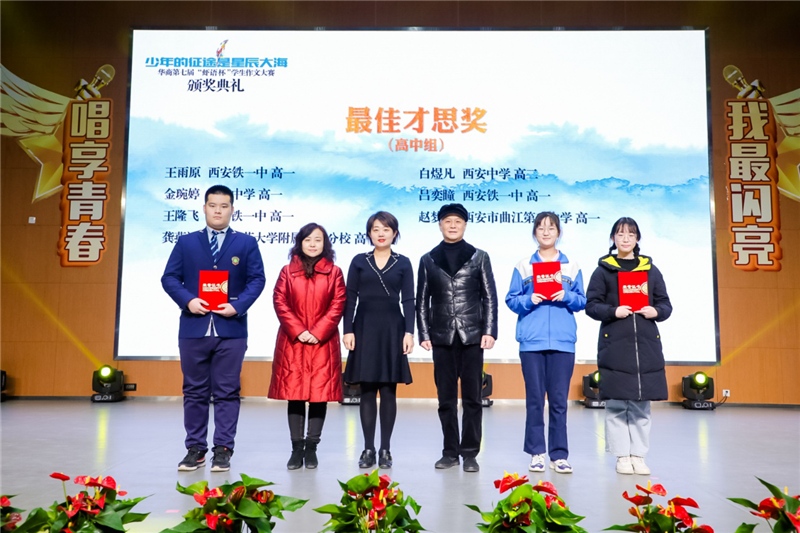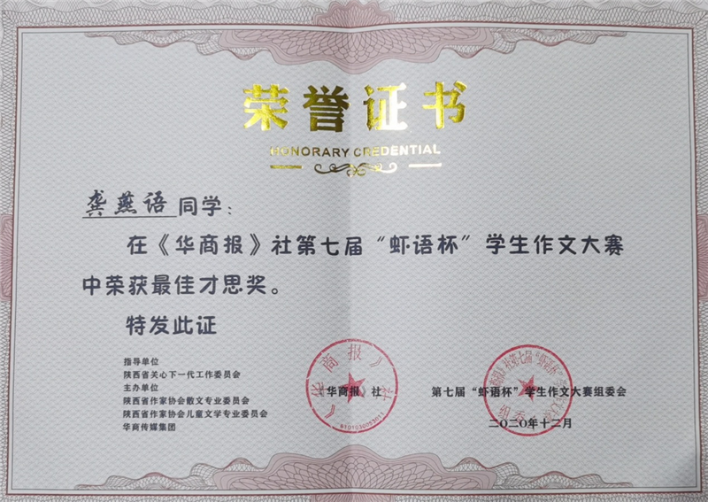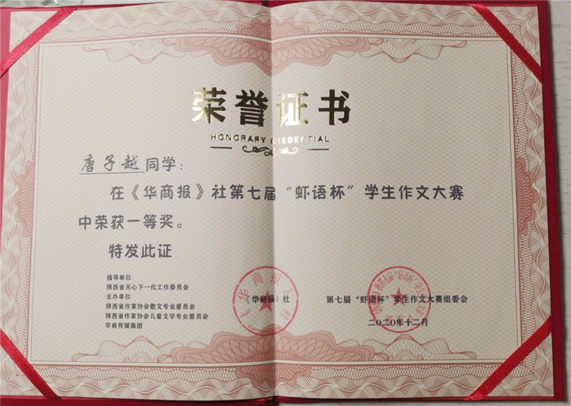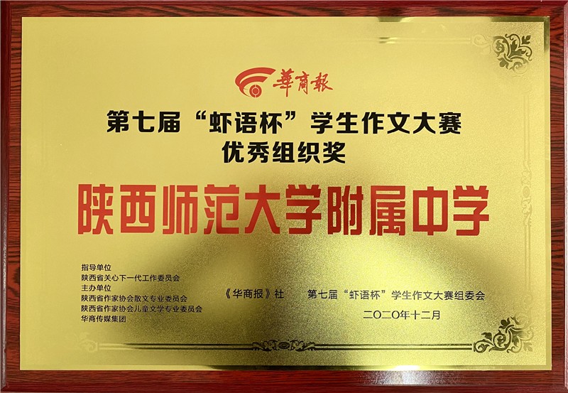 2020年12月25日,華商第七屆“蝦語杯”學生作文大賽頒獎典禮在西安高新第一中學舉行。陜西師大附中高2022屆唐子越同學、附中分校高2022屆龔燕語同學分別在吳桐菲老師和胡春麗老師的指導下,取得了一等獎和最佳才思獎的優異成績,我校榮獲優秀組織獎。本次大賽評委蒼向鵬老師、指導老師吳桐菲及獲獎學生代表參加了此次頒獎典禮。