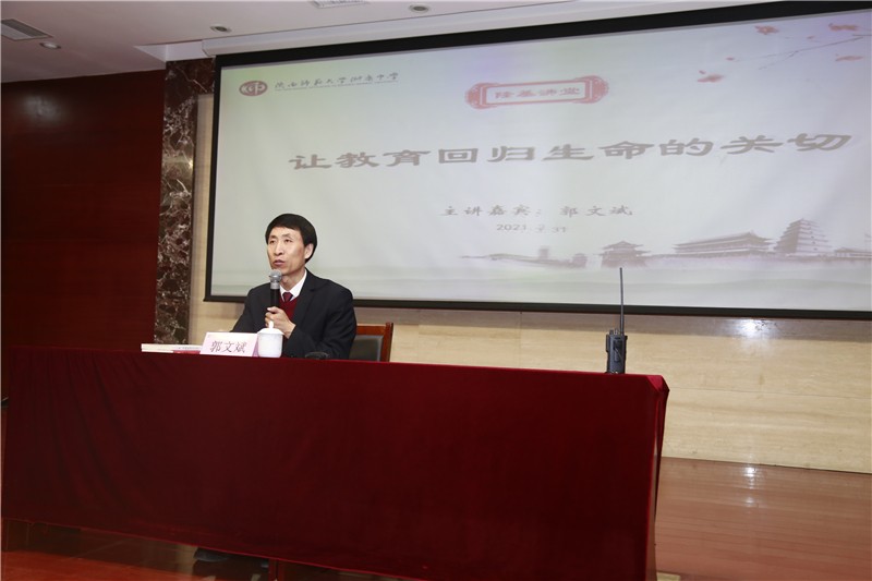 為不斷提升教職工履職盡責能力,建設學習型團隊,以新氣象、新作為開啟陜西師大附中教育聯合體全面發展的新局面,3月31日下午,陜西師大附中教育聯合體在崇文樓五層報告廳舉辦《隆基講堂》第九期報告會,特邀寧夏作協主席郭文斌作《讓教育回歸生命的關切》的主題報告。附中校長馮軍,副校長郭勝、高麗文等領導,附中和分校全體教職工,教育聯合體成員校雁塔區第二中學、灃西新城第二學校、灃西新城第四學校部分教師參加了報告會,同時陜西師大附中渭北中學、涇河新城第二學校全體教師通過直播同步觀看了報告。報告會由學校辦公室副主任江志勇主持。