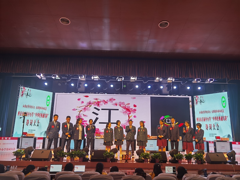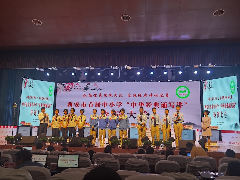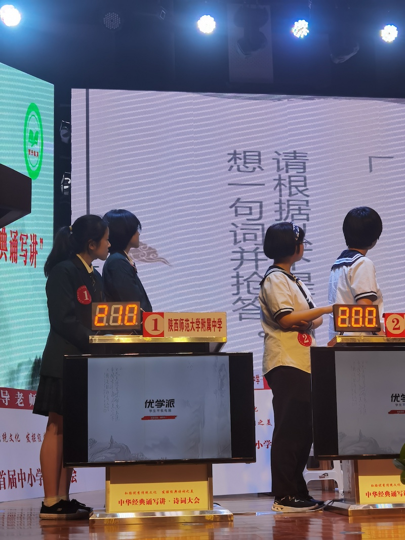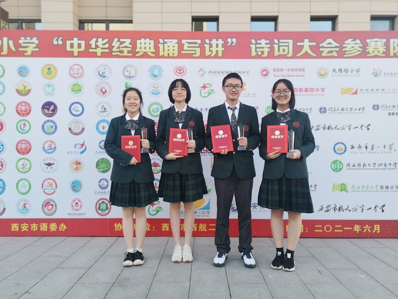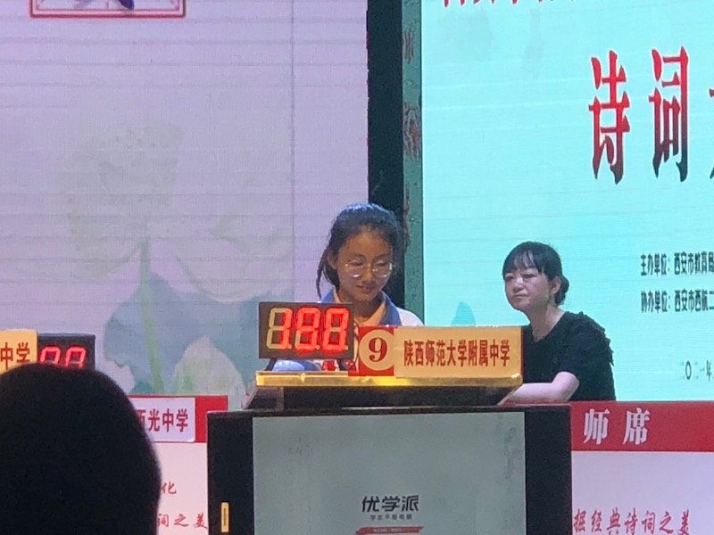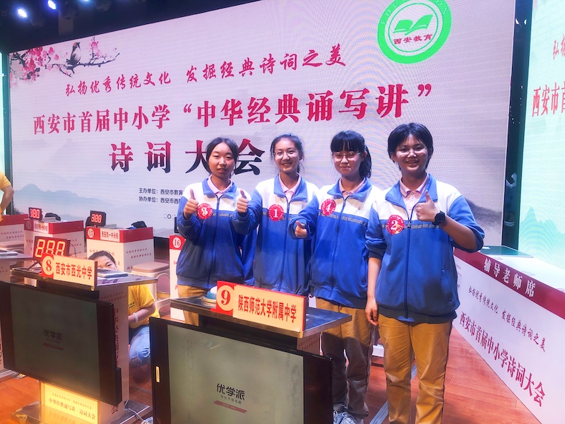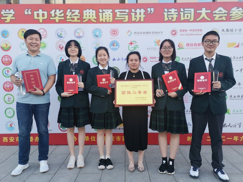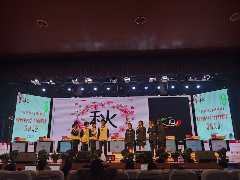 我校政教處副主任索海峰任領隊,附中分校初二代表隊、附中高二代表隊代表雁塔區分別參加了本屆大賽初中組和高中組的比賽。比賽中,八位參賽選手表現出良好的心理素質,深厚的詩詞積淀,在與全市其他32支代表隊的角逐中,同學們延續著區賽中的良好狀態,一路過關斬將,最終雙雙斬獲季軍的佳績。最終我校榮獲團體二等獎、八位參賽同學被評為優秀選手,輔導教師陳新、田甲林被評為優秀輔導教師。