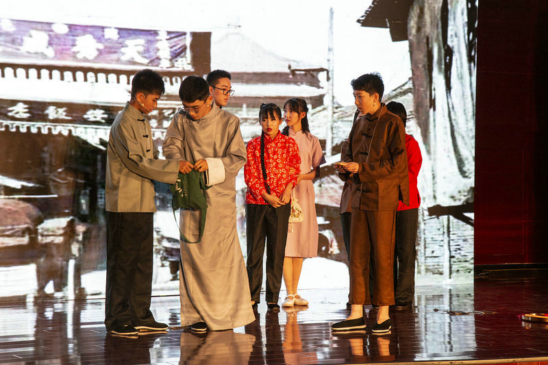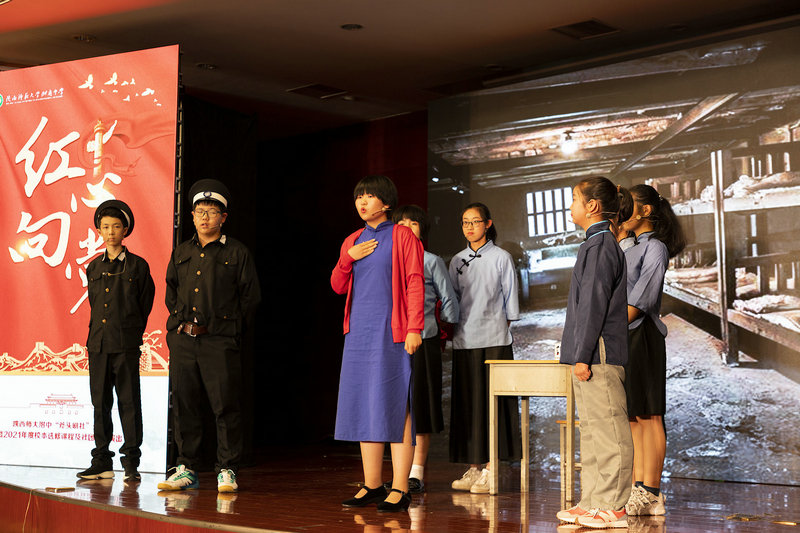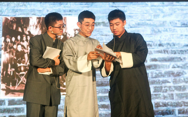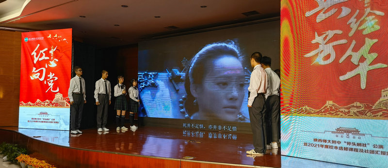 活動在我校“斧頭劇社”第一部歷史題材話劇《一曲悲歌憾民心》的公演中拉開序幕。該劇以張寒暉在陜西省立二中(陜西師大附中前身)的教育教學活動為主線,追尋烈士革命足跡,通過張寒暉老師給學生授課,關心啟迪民眾、創作《松花江上》等劇情,塑造以張寒暉為代表的一代附中教師形象,也塑造了一個熱愛祖國,熱愛教育事業,拯救人民于水火之中的“國士”形象。我校“斧頭劇社”成員在陜西師范大學李晨子老師、我校語文組楊梅老師的指導下,深情演繹,將大家帶入到那個風起云涌的年代,讓大家充分感受到張寒暉的人格魅力和我校的革命傳統,真切表達了附中師生對寒暉精神的深深敬意、對建黨百年的濃厚情懷。