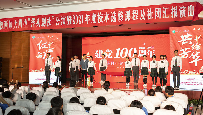 為慶祝中國共產黨成立100周年,全面展示我校豐富多彩的校園文化生活,彰顯五育并舉的育人成果, 6月16日下午,學校在崇文樓報告廳舉行了紅心向黨·共繪芳華——陜西師大附中“斧頭劇社”公演暨2021年度校本選修課程及社團匯報演出活動。我校副校長高麗文、教研室主任董翼、政教處副主任鮑青青、符潔,非畢業年級組長、“斧頭劇社”指導教師楊梅、部分校本選修課程及社團師生代表參加了此次活動。