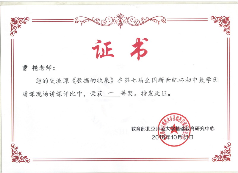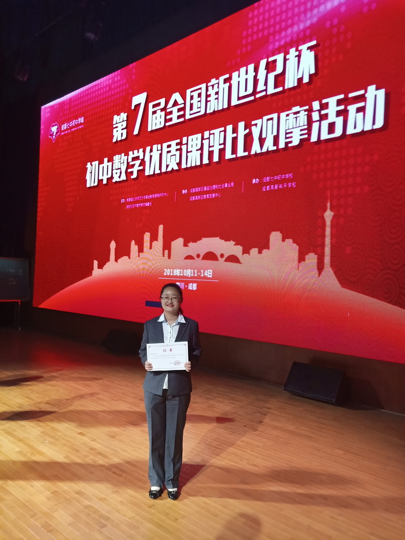 10月12日至13日,由教育部北京師范大學基礎教育課程中心、新世紀初中數學編委會主辦的第七屆全國新世紀杯初中數學優質課評比活動在成都七中初中學校成功舉辦,我校數學組教師曹艷代表陜西省參加現場講課比賽并喜獲大賽一等獎(最高獎項),同時在頒獎典禮上獲得了評委的點名表揚。