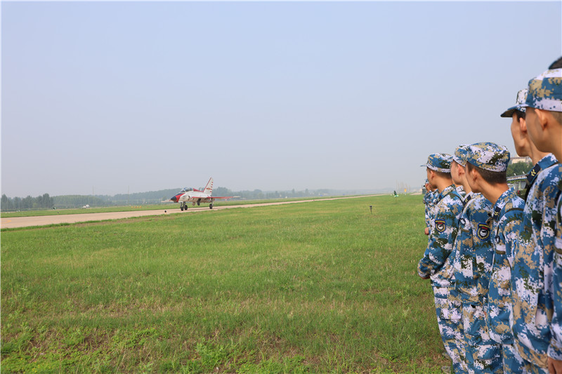 戰鷹的轟鳴聲愈來愈近,精彩的飛行訓練拉開帷幕。飛行姿態不斷變換,同學們的贊嘆聲不絕于耳,用青澀的軍禮迎接戰鷹的著陸滑回。