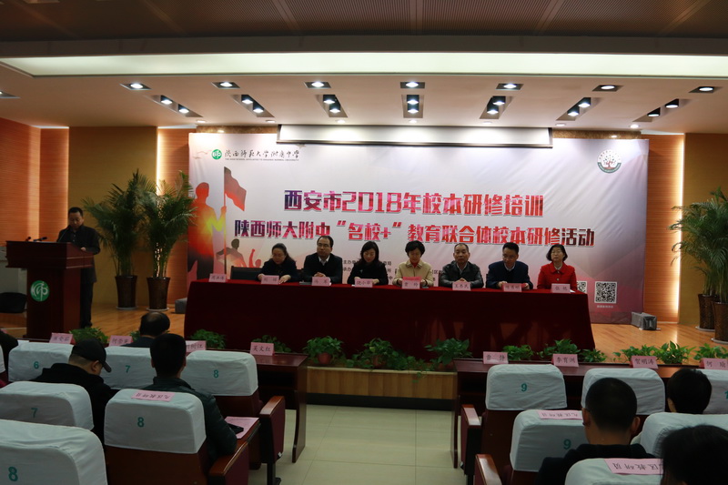 11月15日上午8:30,西安市2018年校本研修培訓第十四期暨陜西師大附中“名校+”教育聯合體校本研修活動在我校科技樓報告廳開幕。西安市教科所副所長賈玲,雁塔區黨委委員 教育督導室主任饒小華,雁塔區進修學校校長王養民,我校校長馮軍、黨委書記陳勇剛、副校長高麗文等領導出席了開幕式。開幕式由西安市教科所培訓部主任周洪濤主持。