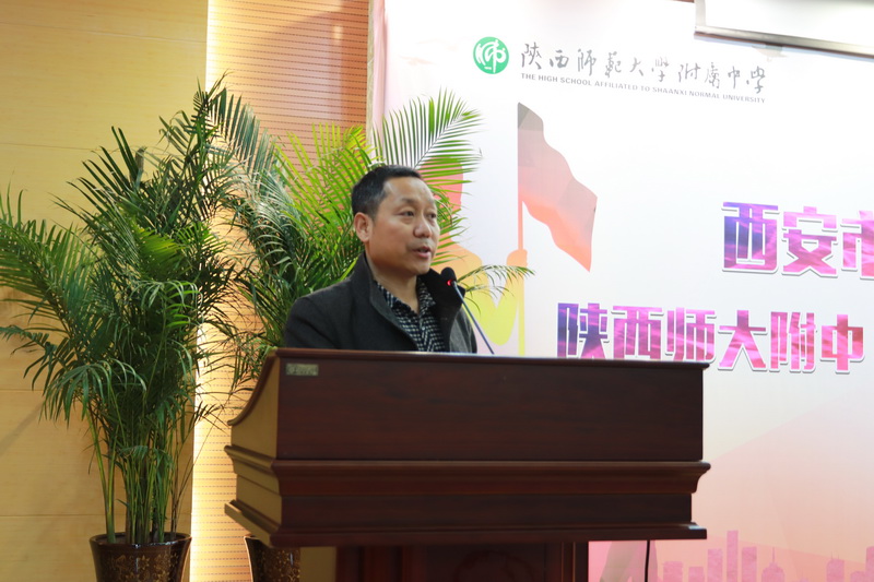 我校校長馮軍致開幕詞。馮校長首先對與會的各位領導、專家、老師的到來表示熱烈地歡迎,他表示“名校+”工程校本研修培訓活動在我校舉行給我校教師提供了一次近距離學習交流的機會,也是陜西師大附中作為省級示范性高中履行自己責任、義務,為促進區域基礎教育均衡發展做出努力的重要實踐行為。我校將以最大的誠意和決心,與四十五中,傾力合作,確定工作方向和發展重點,扎實推進工作,促進兩校深度融合,實現教育教學質量的共同提升。