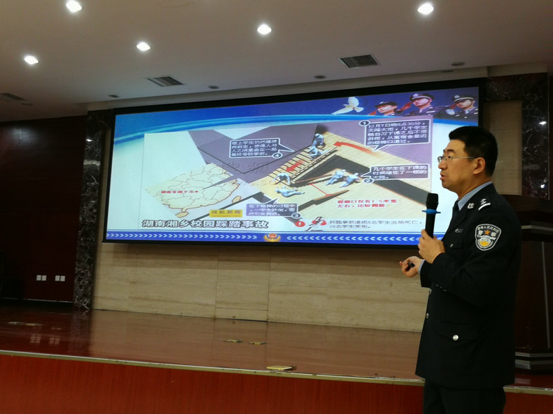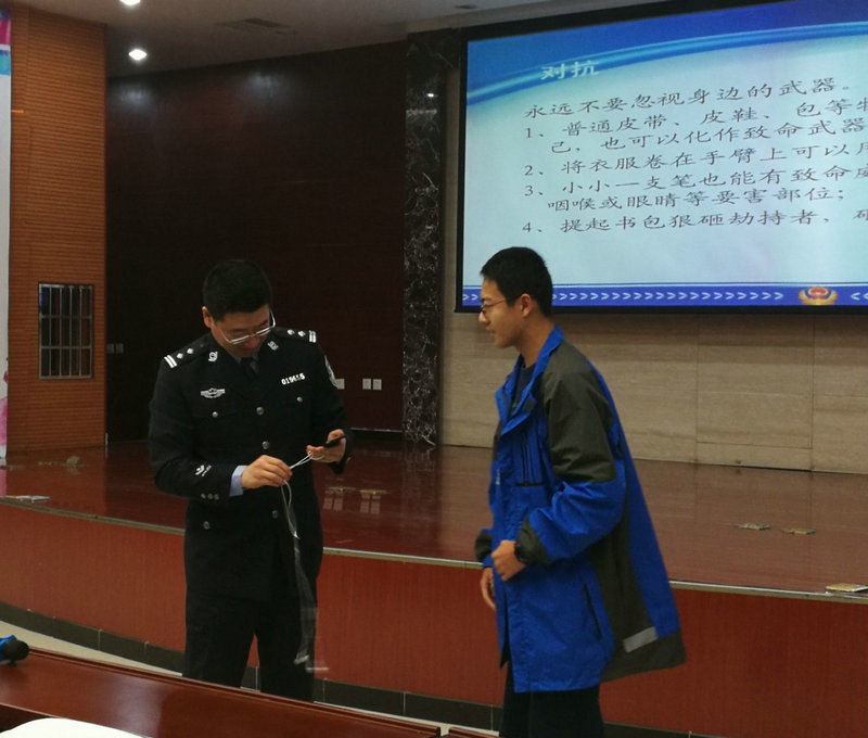 首先,章凡警官就國內、尤其是我省近年內發生的校園安全事故做了簡單通報,向各位老師和同學重點闡述了校園安全的重要性和緊迫性,并對我校積極開展校園安全培訓給予了充分肯定;接著,章警官從交通事故、樓道踩踏、防扒防竊、校園欺凌幾個方面分別作了闡述,以案例入手,剖析原因,并當場演示在事故發生時,如何規避風險,防范傷害的發生。章警官的培訓和演示得到了全場師生的熱烈掌聲。