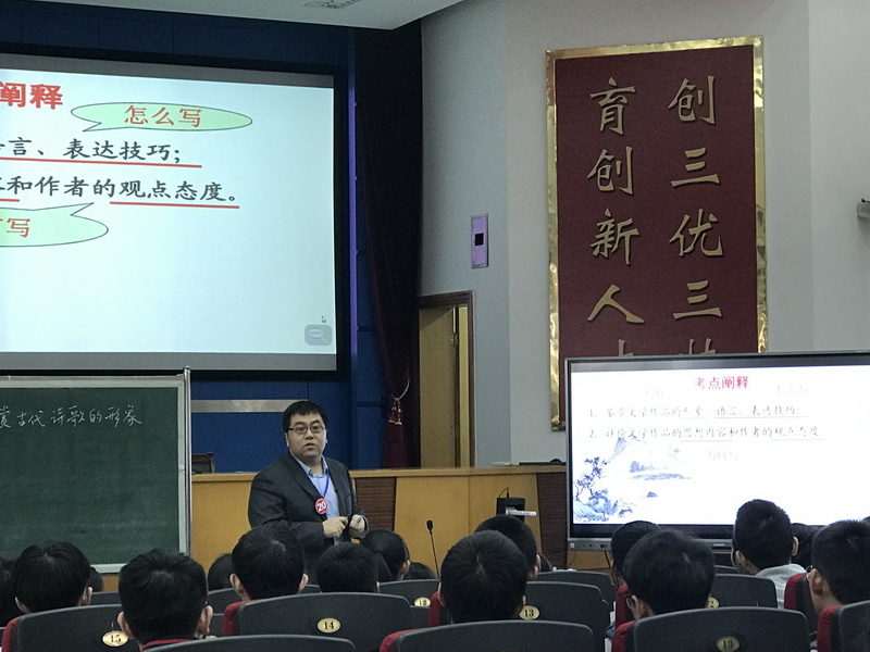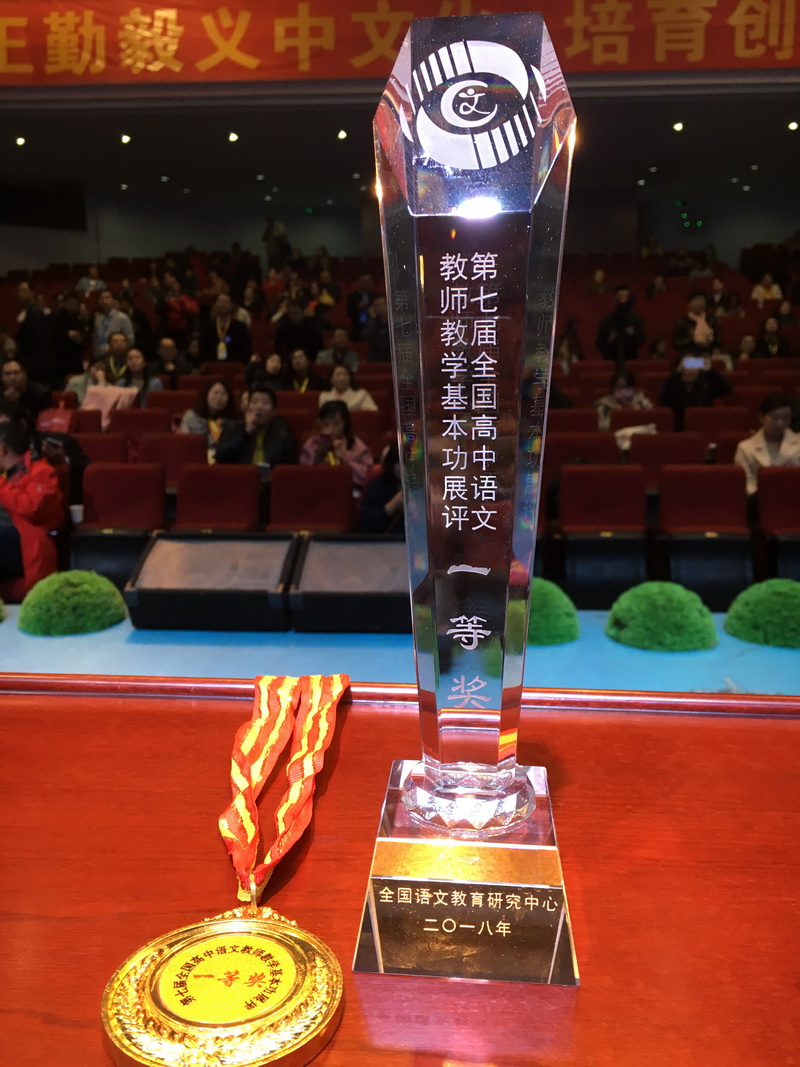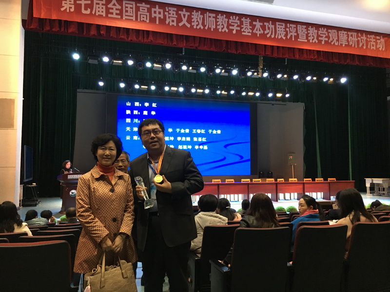 按照賽制安排,來自全國二十多個省區市的24名老師角逐現場課比賽,抽簽決定課型和上課順序,24至48小時備課,課前15分鐘與學生見面交流,40分鐘課堂展示,3分鐘課后反思。董翼老師抽到的課型是高三復習課,經過賈玲老師的現場指導和高校長、萬瓊老師在電話里的出謀劃策,最終以切實的目標定位、精彩的設計思路、有層次的學生學習活動、平等和諧的師生互動和沉穩的課堂駕馭能力,憑借扎實的語文教學基本功,贏得評委們的一致好評,榮獲大賽一等獎!