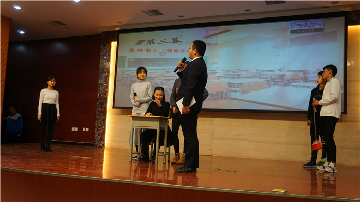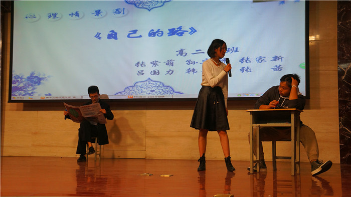 2018年11月28日、29日下午,借助第十五屆“漢語(yǔ)風(fēng)采大賽”平臺(tái),高2020屆原創(chuàng)校園心理情景劇展演活動(dòng)在綜合樓五層報(bào)告廳舉行。本次活動(dòng)面向高二年級(jí)全體師生,主題是“‘心’系成長(zhǎng) ‘劇’焦心理”。