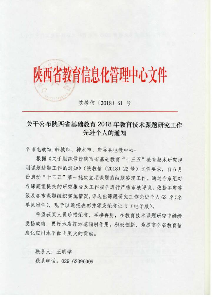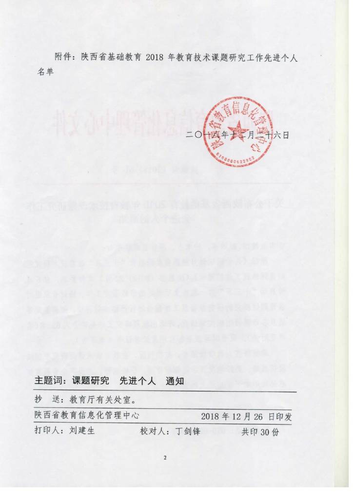馬立老師榮獲陜西省2018年教育技術(shù)課題研究工作先進(jìn)個(gè)人