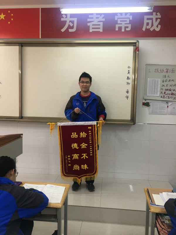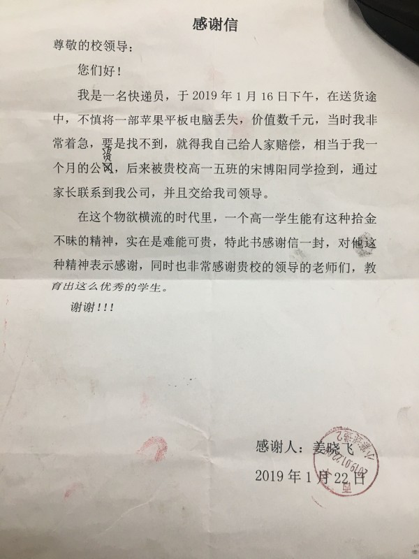 我校高一5班宋博陽(yáng)同學(xué),于2019年1月16日下午,撿到一臺(tái)價(jià)值數(shù)千元的蘋果平板電腦。該同學(xué)第一時(shí)間在父母的幫助下聯(lián)系到失主所在公司,并交給其公司領(lǐng)導(dǎo)。失主是一名快遞員,若電腦丟失,他將承擔(dān)高額的賠償費(fèi)用,對(duì)于失而復(fù)得的電腦,失主非常激動(dòng),寫信表?yè)P(yáng)宋博陽(yáng)同學(xué),并送來了錦旗到我校,表達(dá)了他對(duì)該同學(xué)拾金不昧優(yōu)秀品格的高度贊賞,對(duì)學(xué)校培養(yǎng)出這么優(yōu)秀的學(xué)生表示深深的謝意。