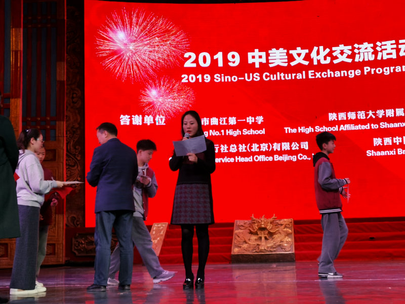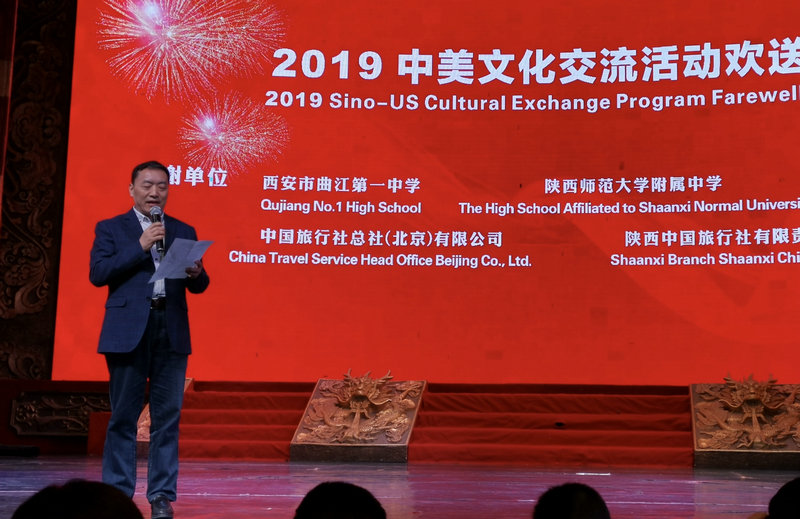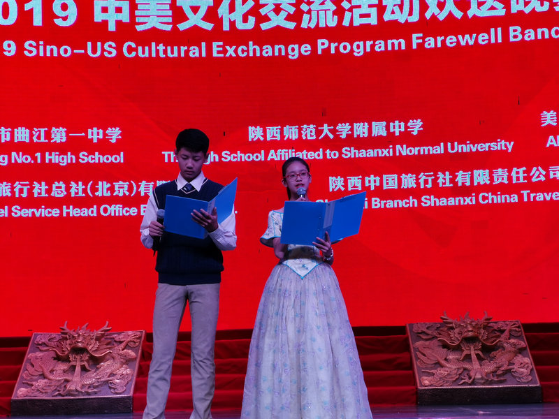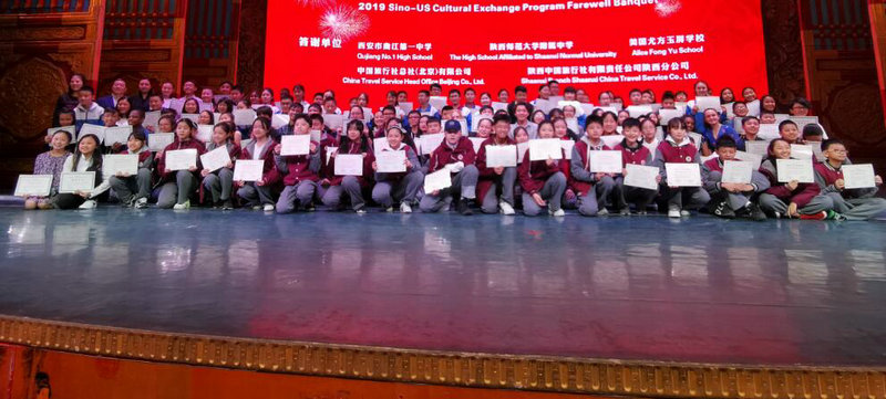 3月18日晚,中美三所學(xué)校的師生、家長(zhǎng)歡聚一堂,在西安陽(yáng)光麗都大劇院舉行了2019年中美文化交流活動(dòng)歡送儀式,張帆副校長(zhǎng)致歡送詞,他表示此次尤方玉屏學(xué)校師生的來(lái)訪對(duì)于三所學(xué)校之間的交流、合作具有紀(jì)念意義,希望將來(lái)能夠進(jìn)行更深入的交流訪問(wèn);尤方玉屏學(xué)校副校長(zhǎng)也表達(dá)了對(duì)陜西師大附中、曲江一中兩所學(xué)校為他們提供了此次訪問(wèn)機(jī)會(huì)的感謝,并希望兩所學(xué)校將來(lái)有機(jī)會(huì)蒞臨她們學(xué)校進(jìn)行交流、訪問(wèn);我校學(xué)生代表李奕霖、黃子茜向來(lái)訪的師生表達(dá)了幾日來(lái)與自己搭檔的生活故事,并表示會(huì)珍惜這段美好的時(shí)光、非常期待暑期的回訪活動(dòng);尤方玉屏學(xué)校的學(xué)生代表也向兩所學(xué)校和接待的家庭表示了感謝;最后我校張帆副校長(zhǎng)及政教處鮑青青副主任為尤方玉屏學(xué)校來(lái)訪的學(xué)生及我校和曲江一中接待學(xué)生頒發(fā)結(jié)業(yè)證書及優(yōu)秀接待證書。