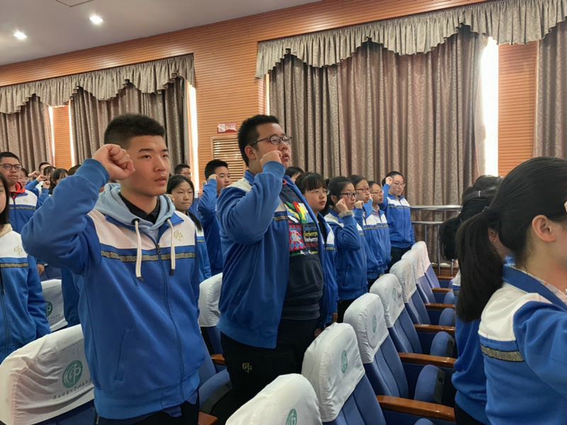 最后,學生代表從校長手中接過附中校旗,莊嚴宣誓,“劍指彼岸,共筑明天”。